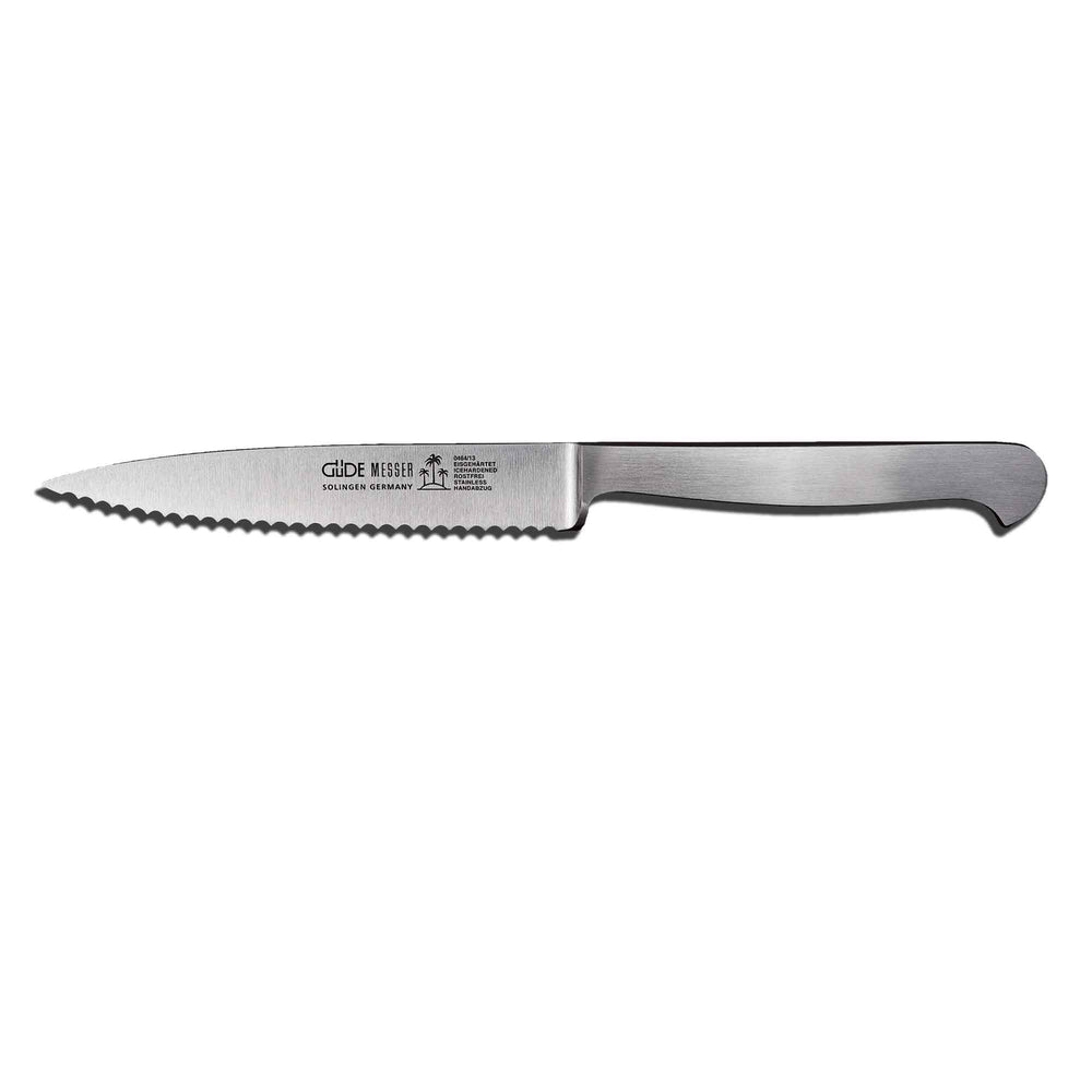 Das Güde Kappa Tomatenmesser ist besonders wegen seiner hohen Qualität und Schärfe. Es ist aus rostfreiem Edelstahl gefertigt und hat eine spezielle Wellenschliffklinge, die für eine präzise und saubere Schnittführung sorgt. Die Griffe aus Olivenholz verleihen dem Messer eine besondere Optik und Haptik. Es ist auch für die Verwendung beim Schneiden von Tomaten konzipiert, aber auch für andere empfindliche Früchte und Gemüse geeignet.