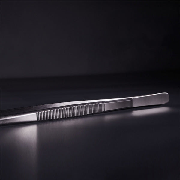 Aus rostfreiem Edelstahl in Chirurgenqualität, präzise und stabil. Die Pinzette mit gerundeter, innen geriffelter Spitze hält schonend alles fest. Die geriffelten und rutschfesten Griffflächen öffnen sich weit genug für alle Anwendungen.