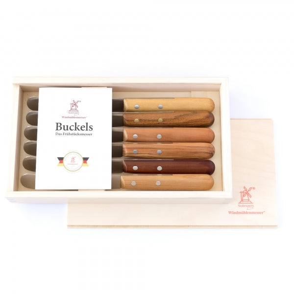 6er-Sortiment mit Buckels in 6 verschiedenen Hölzern aufgelegt -