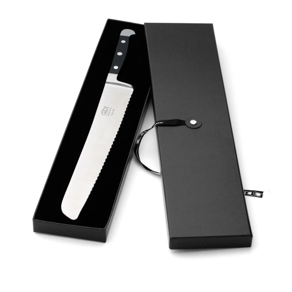 Das Brotmesser "Franz Güde" ist DAS BROTMESSER. Brot muß gesägt werden, nicht beim Schneiden zerquetscht. Aus diesem Grund ist dieses Brotmesser mit seiner 32cm langen Klinge länger, als ein Laib Brot breit ist.