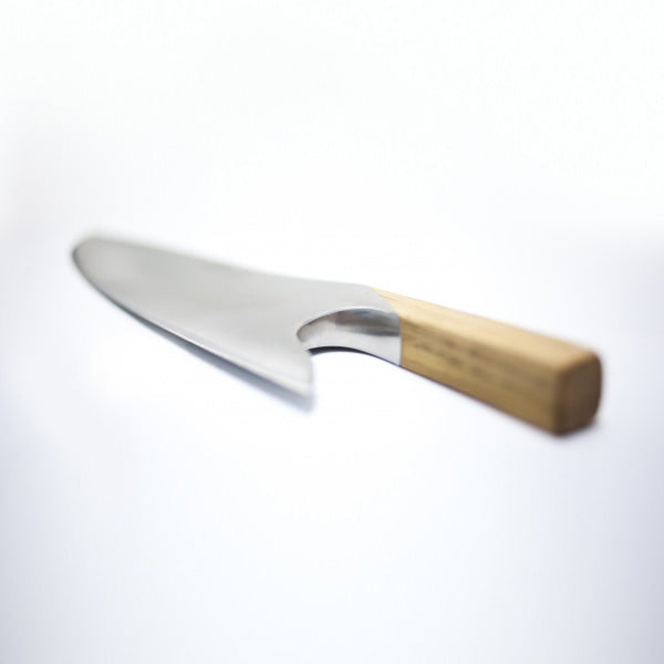 Schon auf den ersten Blick wird klar, dass The Knife. relativ wenig mit einem herkömmlichen Kochmesser zu tun hat. Der vermeintlich kurze Griff und die auffällig große Klinge mit dem sehr breiten Rücken – nur bei einem geschmiedeten Messer so zu realisieren – lassen eher an ein Designobjekt denken.