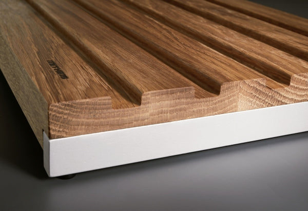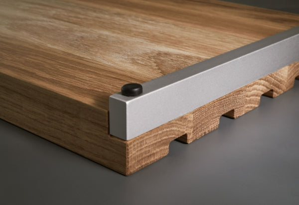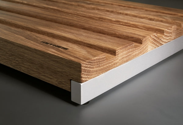 Der Brotschneidebrett ist aus europäischer Eiche und wird in Österreich von Hand gefertigt. Die tiefen Rillen fangen die Brotkrümel auf und sind leicht zu reinigen. Die eleganten Aluminiumleisten mit kleinen Gummifüßen machen das Brotschneidebrett auch rutschfest.