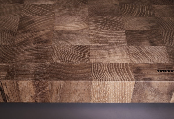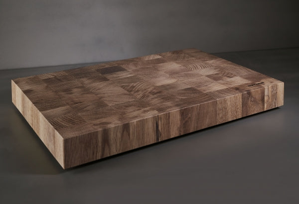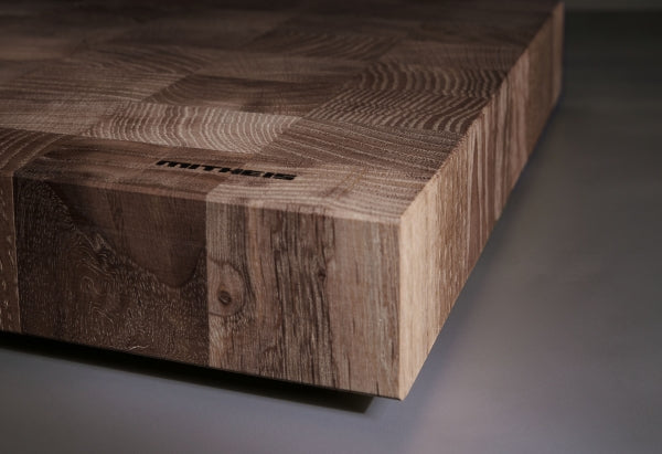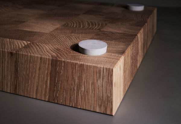 Der Hackblock ist aus Eiche Stirnholz, bietet also besonders guten Widerstand beim Hacken. Die dämpfenden Gummifüße machen den Hackblock auch rutschfest.