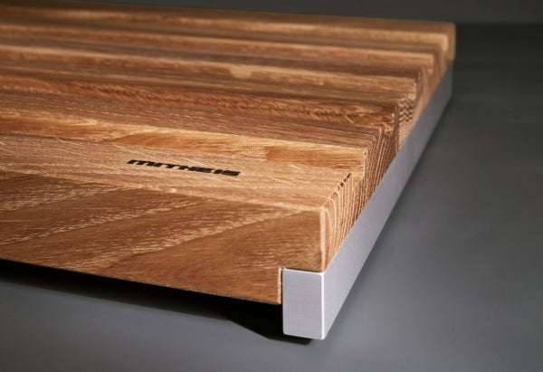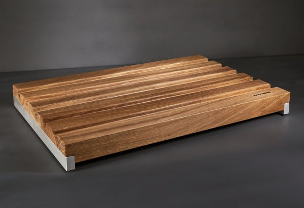 Das Brotschneidebrett ist aus europäischer Eiche und wird in Österreich von Hand gefertigt. Die tiefen Rillen fangen die Brotkrümel auf und sind leicht zu reinigen. Die eleganten Aluminiumleisten mit kleinen Gummifüßen machen das Brotschneidebrett auch rutschfest.