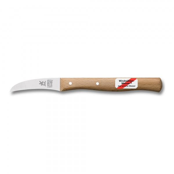 Dieses Schälmesser gehört zu den am feinsten ausgeschliffenen Messern der Windmühle. Es hat einen verlängerten, gut ausbalancierten Griff, der beim Schneiden wie angepasst in der Hand liegt. Kartoffeln oder Obst lassen sich am besten mit diesem Messer schälen.
