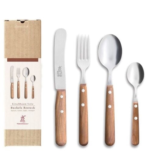 Das Windmühlenmesser Buckels Besteck Set ist aus hochwertigem rostfreiem Chrom-Molybdän-Vanadium Stahl, von Hand feingepließtet und nach dem Prinzip des "Solinger Dünnschliffs" gefertigt. Die Griffe sind aus gedämpftem Kirschbaumholz und liegen angenehm in der Hand. Das Windmühlenmesser Buckels Besteck Set ist nicht spülmaschinengeeignet und sollte nach Gebrauch gereinigt und sofort abgetrocknet werden.